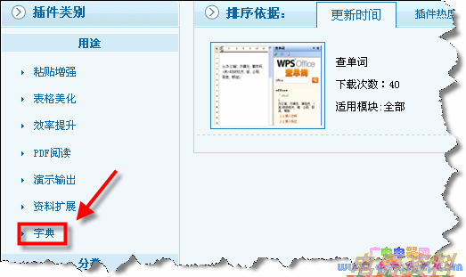 2、用单击“用途”中的“字典”,右侧显示查单词插件。