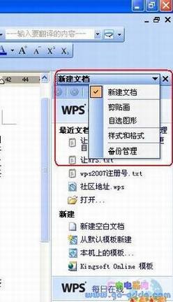 在WPS三兄弟中不知大家是否注意?三兄弟中都一个相同的功能,那就是——任务窗格。有效利用“任务窗格”操作,可以使我们的操作效率达到事半功倍的效果。在“任务窗格”中默认的是“新建文档”,它可以方便我们直接打开最近编辑过的文档。当我们点击“打开”时,不但能帮助我们快速打开其它文档,还能新建空白文档。并且,还能从模板中新建以及打开Kingt Online模板。当我们在“任务窗格”的顶端点击“新建文档”右侧的下拉三角后(如图01),还能快速地打开剪切画与自选图形窗口,同时也能对长篇文档进行样式编辑。不过,最具特色的还是其强大的“备份管理”功能。