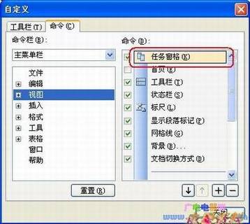 如果要是你认为打开“任务窗格”时,按Ctrl键+F1不方便,那么我们还可以自行为“任务窗格”指定一个快捷操作键。方法是在菜单栏中点击“工具——自定义”(也可以在‘工具栏’的空白处,右击,选择‘自定义’),在打开的“自定义”对话框中,先选择“命令”标签,之后点击“普通工具栏”右侧的下拉三角,选择“主菜单栏”,然后在“主菜单栏”中点击“视图”,这样,在右侧的“命令”框中,顶端显示的第一个就“任务窗格”了(如图04),此时,只要在“任务窗格”上右击鼠标,选择“编辑”,之后在打开的“修改命令项”对话框中,在“控制”的快捷键框中,根据实际情况自行指定一组快捷键即可(如图05),然后点击关闭对话框即可。这样,在以后的操作中,就可以使用我们自行指定的快捷键打开“任务窗格”了。