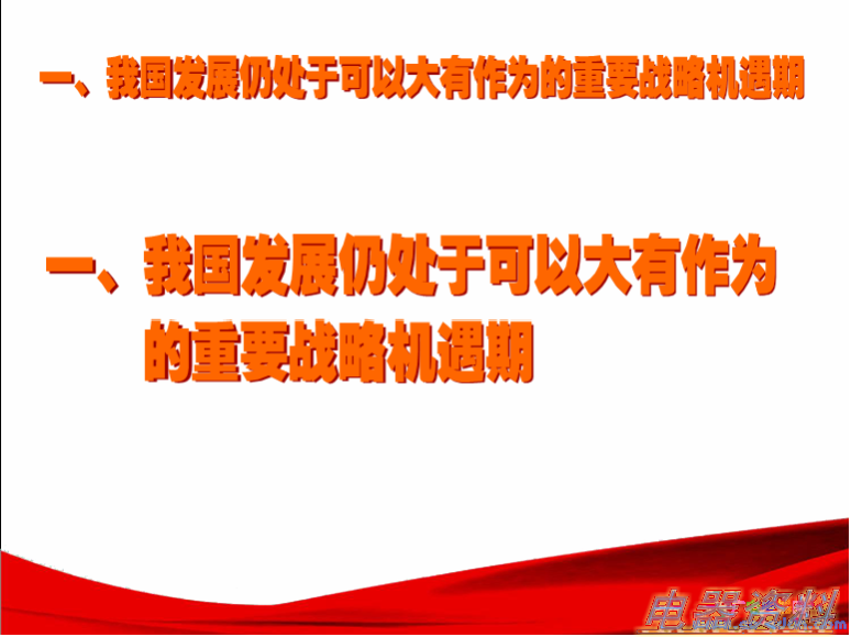 到此,这张幻灯片制做完成。播放一下,效果为:播放到此幻灯片时,首先出现醒目的双行标题,点击后双行标题分别移动并缩小到顶部位置,合并为一行。