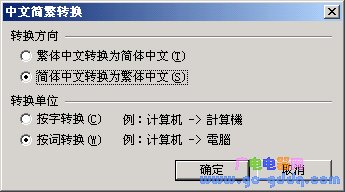 打开“工具―中文繁简转换”,调出设置面板(如图1),在“转换单位”选项中选中“按词转换”。