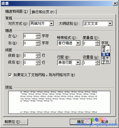 首先,打开“段落”设置面板,在“特殊格式”中选择“首行缩进”,然后,把指向“度量值”后面的“字符”二字。发现什么了?对,“字符”二字后面出现了一个小黑三角!用鼠标点一下这个黑三角,就可以在磅、英寸、厘米、毫米、字符中任选其一做度量单位了!(如图2)