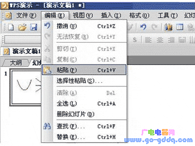 在编辑“菜单”中选择“粘贴”,在剪贴板中的图像就被复制到演示文稿中了。