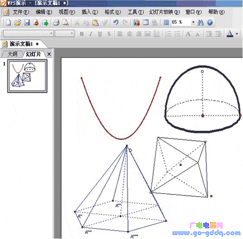 在制作演示文稿时候经常遇到要画图说明问题的情况,虽然金山WPS演示中已经提供了很多作图工具以及模板,但是有时候也不能满足一些特殊的作图需要,比如演示数学函数图像的时候,函数图形要求很严格,很精细,不能出现科学错误。
