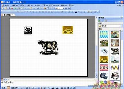 忽然,负责辅导的微机老师和小张老师一起来找我,说是他们平常用惯了WPS Offe 2005,因此准备使用WPS演示制作幻灯片,操作倒也与Microt PowerPoint大致相仿,但有一个问题,那就是WPS演示中的剪贴画太少,这样课件的效果就大打折扣了,如果完全自己绘制或扫描,时间上恐怕来不及…