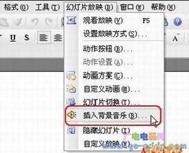 下面就来说明插入背景音乐的步骤:单击菜单栏上的“幻灯片放映→插入背景音乐”命令。见图1: