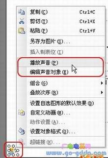 当插入背景音乐后,会在幻灯片左下角出现一个代表背景音乐的声音图标。这时,您可以在这个图标上点击右键,在快捷菜单上选择“播放声音”来检测插入的文件是否可以播放。单击即可结束播放。见图2: