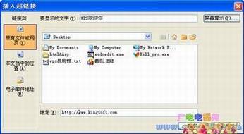 步骤2 选择“插入|超链接”菜单项,弹出“插入超链接”对话框,在“要显示的文字”中输入相应的文字,“地址”框输入地址(如图32)。也可以在“链接到”选择链接到“本文档中的位置”或“电子邮件地址”。