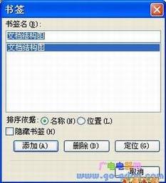 选中要设置为书签的文字或表格等区域,选择“插入|书签”选项卡,然后在“书签名”中输入预定义的名字(如图33)。
