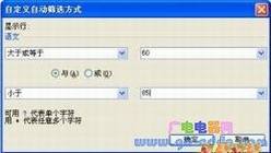 操作步骤:点击列标题‘语文’右侧下拉按钮,选择下拉菜单中的‘自定义’,弹出‘自定义自动筛选方式’对话框,选择‘大于或等于’,输入‘60’,选择‘与’的关系后,选择‘小于’,输入‘85’,如图4 :单击确定。