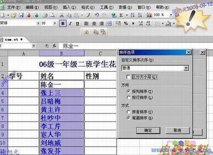 1、选中我们已输入的学生姓名数据区域,单击数据下拉菜单后,单击排序,在排序选项卡中单击“选项”见图1: