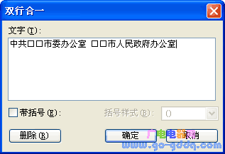 选中此双行文字,再次选择“格式|中文版式|双行合一”菜单项,打开“双行合一”对话框,在“中共□□市委办公室”后面,适当增加空格,再点击“确定”按钮,得到如图5的显示效果。