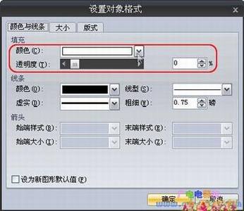 选择“设置对象格式”菜单项后,会弹出“设置对象格式”对话框。在“设置对象格式”对话框中,把“填充”项里的颜色设置为“无填充颜色”或把透明度设为“0%”。见图5: