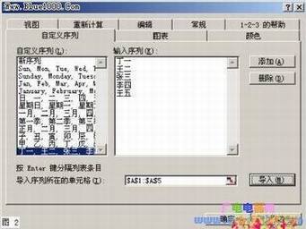 将职工姓名输入连续的单元格中,并选中他们,用"工具→选项"命令打开"选项"对话框(如图 2),选"自定义序列"标签,先后按"导入"、"确定"按钮。以后在任一单元格中输入某一职工姓名(不一定非得是第1位职工的姓名),用"填充柄"即可将该职工后面的职工姓名快速填入后续的单元格中。