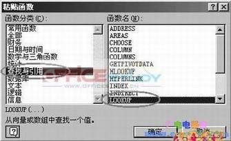 2. 单击格式工具栏上的[插入函数]按钮,接着在“粘贴函数”对话框中的“函数分类”栏选择“查找与引用”,“函数名”选择“LOOKUP”,单击[确定]按钮(如图2)。