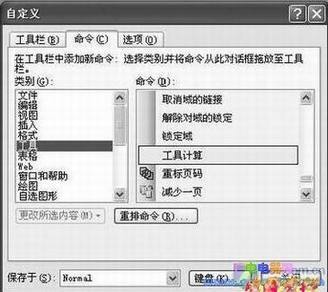 在“自定义/命令”对话框中的“工具”类别命令可以找到它并将其拖到某个工具栏上松开即可(如图2)。需要我们计算数据结果的时候,首先在文档中输入想要计算的式子以及“=”号,接下来选中输入的式子并按一下工具栏上“工具计算”按钮,然后将光标定在“=”号后面,按下“l+V”执行“粘贴”功能,这样计算的结果就会显示在光标处了。