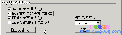 在键入时word可以对我们键入的文字进行拼写和语法检查,在页面上可以看到红红绿绿的波浪线。如果你觉得这些线太影响视觉效果,可以将其隐藏。在状态栏上的“拼写和语法状态”图标上单击右键,选择“隐藏语法错误”项,语法检查出来的错误标记就全都不见了。如果要详细设定,可以在右键菜单中选择“选项”,在“选项”对话框中单击“拼写和语法”选项卡,在这里我们可以详细设定拼写和语法的属性。
