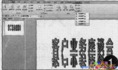 1.在WPS演示程序中点击“插入”菜单,选“艺术字”,在弹出的“艺术字库”中任选一种艺术字特效,输入需要的文字(如“客户业务座谈会”)并设定字体和字号。