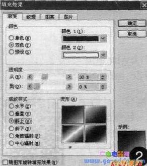 5.在倒立的艺术字上右击鼠标,在弹出的菜单中选“设置对象格式”,在“颜色”下拉菜单中选定“填充效果”,在弹出的“填充效果”中选“渐变”,颜色选“双色”,“颜色1”选蓝色,“颜色2”选白色,“透明度”设为30%,“底纹样式”设为“斜上”,连续按两次“确定”按钮后退出结束(图2)。最后,我们就得到了类似汉字在水边倒影的效果图(图3)。