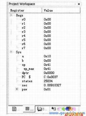 寄存器页面包括了当前的工作寄存器组和系统寄存器,系统寄存器有一些是实际存在的寄存器(如A、B、DPTR、SP、PSW等),有一些是实际中并不存在或虽然存在却不能对其进行操作的(如PC、Status等)。