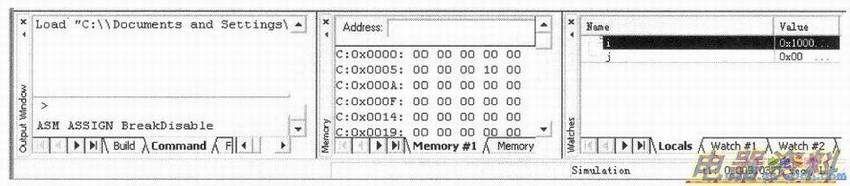 进入调试程序后,输出窗口自动切换到“Command”页(命令窗口)。输出窗口可以输入调试命令,同时可以输出调试信息,调试命令以文本的形式输入,详细的命令语句可以参照“GettingStartedwithμVision2”的说明,大约有30个命令。