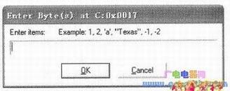 改变显示方式的方法是:按鼠标右键,在弹出的快捷菜单中选择,该菜单用分隔条分成3部分,其中第一部分与第二部分的3个选项为同一级别,选中第一部分的任意选项,内容将以整数形式显示;而选中第二部分的“ASCII”项将以字符型显示,选中“Float”项内容将以相邻4字节组成的浮点数形式显示,选中“Double”项内容将以相邻8字节组成的双精度形式显示。第一部分又有多个选项,其中“Decimal”项是一个开关,如果选中该选项,则窗口中的值将以十进制的形式显示,否则按默认的十六进制方式显示。“Unsigned”和“Signed”后分别有3个选项:Char,Int,Long,分别代表以单字节方式显示、相邻双字节组成整型数方式显示、相邻4字节组成长整型方式显示,而“Unsigned”和“Signed”则分别代表无符号形式和有符号形式,至于究竟从哪一个单元开始相邻单元则与设置有关。第三部分的“ModifyMemoryatX:xx”用于更改鼠标处的内存单元值,选中该项即出现如下图的对话框,可以在对话框中输入要修改的内容。