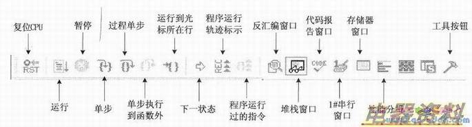 进入调试状态后,界面与编辑界面相比有明显的变化,“Debug”菜单项中原来不能用的命令现在已可以使用了,工具栏中会多出一个用于运行和调试的工具条,如下图所示。