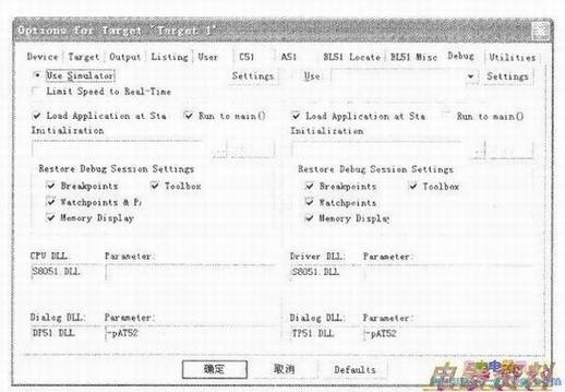 如果源程序代码编译成功,那么运行dScope可以对MCS-51应用程序进行软件仿真调试Simulator。为了运行dScope,在下图所示的“OptionforTarget”对话框的“Debug”选项卡中要选中“UseSimulator”单选项。“LoadApplationatStartup”复选框用于在dScope启动时能够调用自己应用程序的OMF文件,因此也要选中这个复选框。如果不选中此复选框而运行了dScope,则要手动装载应用程序。