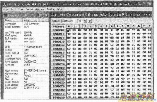 1.设备连接操作。芯达STM开发板的JTAG口(开发板面朝上,最顶端有一个JTAG 20的插口),与J-LinkV8仿真器的输出排线连接,J-Link另一头的USB插口则插在电脑的USB口上。这时,J-Link的指示灯开始闪烁,并保持“点亮”状态。