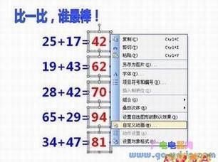 4、拖动鼠标选中所有题目的答案,单击鼠标右键,在快捷菜单中单击“自定义动画”命令(如图5),