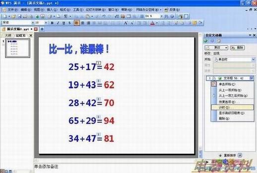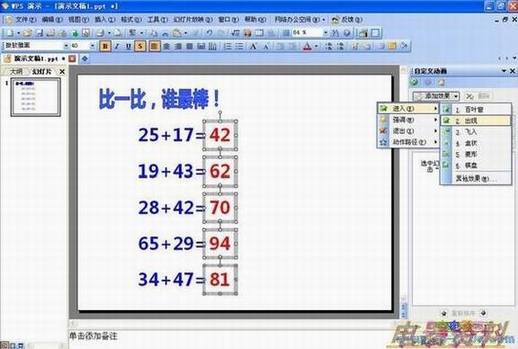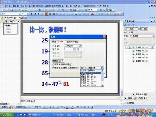 弹出“出现”对话框,单击“触发器”按钮,选中“单击下列对象时启动效果”选项,单击右侧文本框右侧的下拉箭头,在下拉列表中找到与该答案对应的题目“文本框37:25+17=”(如图8)并单击鼠标选中该项,单击“确定”按钮保存设置。这样,我们便将题目“25+17=”设置成了答案“42”出现的触发器。
