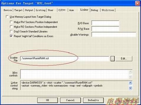 从错误信息中,可以看到RV要找以0x30000000开头的地址空间的Flash下载算法。但这个空间不是Flash地址空间。而是内存空间。这说明,在这个项目中使用的Scatter文件是基于RAM内存空间的。现在打开工程的optiON对话框的Linker标签看看,果然是没错!