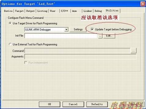1)你既然选择了基于内存的加载方式,应该在Utilities标签中,取消“Update Target before Debugging”,这个选项只能在Flash加载方式中使用。参考如下图。