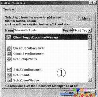 用同样的方法可随心所欲的增加其它按钮,如显示整个图(FitAllObjects),命令为“Sch:ZoomAII”;显示选定的区域(Area),命令为“Sch:ZoomWindow”;拷贝(Copy).命令为“Sch:Copy”;图纸的设置,命令为“Sch:DocumentPreferences”等。