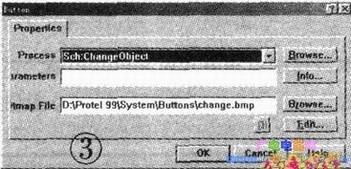 下面以增加一个“Change”按钮为例,说明具体操作过程:首先在图2所示的命令菜单栏中执行“Add”命令,然后按下左键直接拖动或用上移和下移命令使新增加的按钮处于合适的位置,双击新加按钮行或在弹出的图2命令菜单中选择“Properties...”命令,在弹出的对话框中打开“Process”栏的下拉菜单,选择其中的“Sch:ChangeObject”,如图3所示。因Prote199的按钮图标库中没有提供相对应的按钮图标,所以还要对按钮图标进行编辑,此时只要单击图3所示对话框右下方的“Edit...”按钮,即可在Windows的画图板中对其进行编辑,完成后改名另存,最后OK并关闭对话框,查看一下,在你的工具栏中是否出现了一个新的按钮。用此按钮可方便地批量修改图中元件的属性和参数。