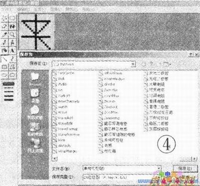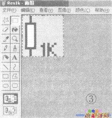 图1面板上的元器件看似元器件图标符号,实际上是一些图标按钮(bmp位图文件)。让我们运行操作系统自带的“画图”软件,打开软件安装路径“…\System\Buttons”下的“Reslk”图标按钮(即图1中的第一个)。如图3所示,图3为放大6倍(6X)的1k图标按钮,点击画图软件菜单栏中的“图像”下的“属性”,可知:宽度18、高度18.单位:,颜色:彩色。了解原图标按钮的属性后开始制作新图标按钮,底色选取“颜料盒”的最底层左起第二小盒(灰色)。线条选择“黑色”、线径选取最细的一根,由于按钮图标面积较小,画图不便,可利用工具栏的放大镜放大到”6X”或“8X”后再画,画斜线和圆时充分利用“Shift"键,可使图线均匀,折线少,线性好、美观。为便于管理,将图标统一存放到软件自带的图标库中,路径为…\System\Buttons。图4中中文名图标是作者保存的图标按钮,仅供参考。