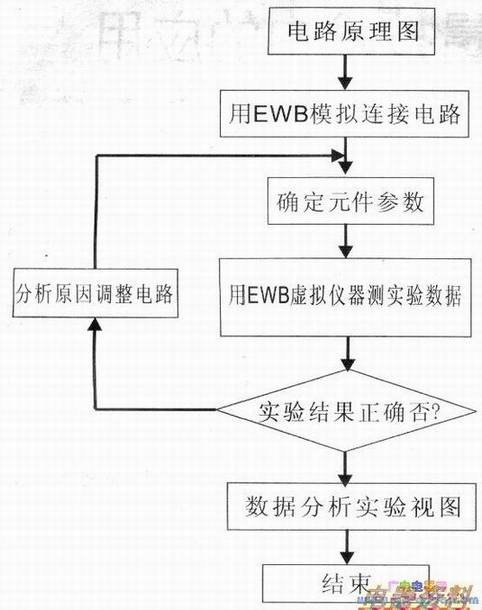 利用EWB不仅可以对常规电路及其实验结果进行虚拟仿真,更重要的是利用EWB可以有效地实现对那些利用常规仪器设备难以观测到的实验现象进行虚拟仿真,例如施密特抗干扰性等。利用EWB进行实验的流程图如上图所示。