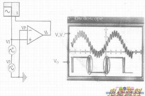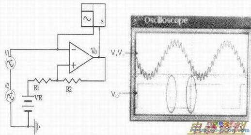 由集成运算放大器构成的基准比较器可以用来对输入Vi进行整形。但此种比较器有一个很大的缺点——抗干扰能力差,即当输入电压Vi接近于基准电压VR时,在理论上讲,若有干扰电压VN出现,输出电压Vo将在Vomax和Vomin之间作不必要的摆动,但在实验室中利用常规仪器设备的方法,很难观察到这一变化。然而,利用EWB很容易仿真这一现象。过零比较器电路及其仿真波形如中图所示。