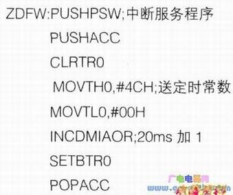 可以看出,每中断一次会比定时值长了5.43μs即5个机器周期,所以我们应考虑由停止计数(CLRTRl)到重新启动计数(SETBTRl)之间的5个机器周期的时间。下面我们来分析一下中断服务程序,CLRTRO指令(定时器停止计时)占1个机器周期,两条MOV指令占了2个机器周期,INC指令占了1个机器周期,SETBTRO(定时器开始计时)占了1个机器周期,在中断服务程序中给定时器赋初值时共占用了5个机器周期,所以,应该在给定时器赋初值时加上这个误差,可以把中断服务程序作如下修改: