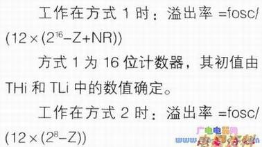 工作在方式O时:溢出率=fosc/(12×(2的13次方-Z+NR)Z为定时器初值,NR为定时器溢出恢复初值的周期数。恢复初值周期数为从定时器溢出到定时器初值重新装入的时间。该段时间和CPU响应中断以及程序中何时重新装入初值有关。