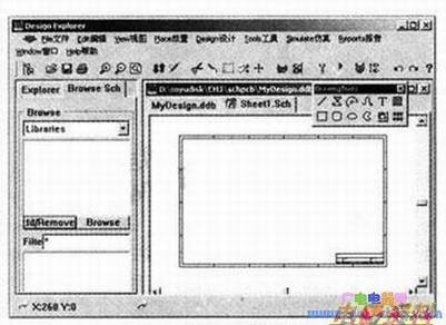 要进行电子线路仿真,就必须绘制一张可以仿真的原理图。也就是说用来仿真的原理图与平时我们绘制的原理图是不同的。其根本的区别是采用不同的元器件库。用于仿真的元器件数据库名为Sim.ddb,它位于Protel99SE安装文件夹的DesignExplorer99SE\Lobrary\Sch目录下。添加器件数据库的操作如下: