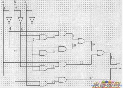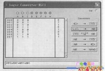 单击Simulate/Instruments/LogConverter,在弹出的逻辑转换仪的控制面板中完成参数设置,如上图所示。相当于完成了组合逻辑电路的设计方法的第1步--建立真直表。设计第二部:由真值表推导出逻辑表达式。在下图中,单击