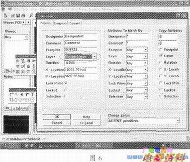 7、对着板子中某个元件,双击打开“Component”属性对话框,点选“Global”高级项,将“Properties”页面中的“Layer”项设置为“BottomLayer”。如图6所示: