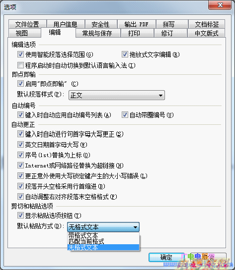 我们建议将其设置为“无格式文本”这样一来,当我们从网页上或者其它文档中粘贴文字到当前文档中时,就不会破坏当前文档现有的格式了。