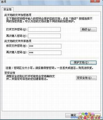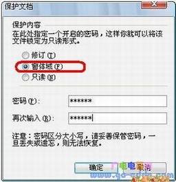 在菜单“文件→文件加密”或在保存/另存为对话框中点击“加密”按钮,在“选项”对话框中键入“修改文件密码”,再点“保护文档”按钮,如方法一设置。如图5: