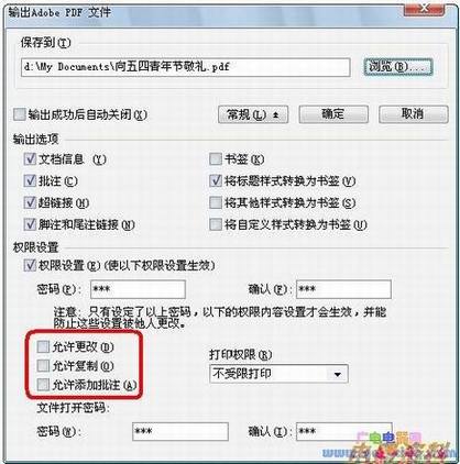 在权限设置中勾消“允许更改”“允许复制”“允许添加批注”等,填写相应的“密码”后,点击“确定”即可生成.PDF文件。PDF格式文件对版权的保护是公认的,要想修改,至少得老鸟级的才行。