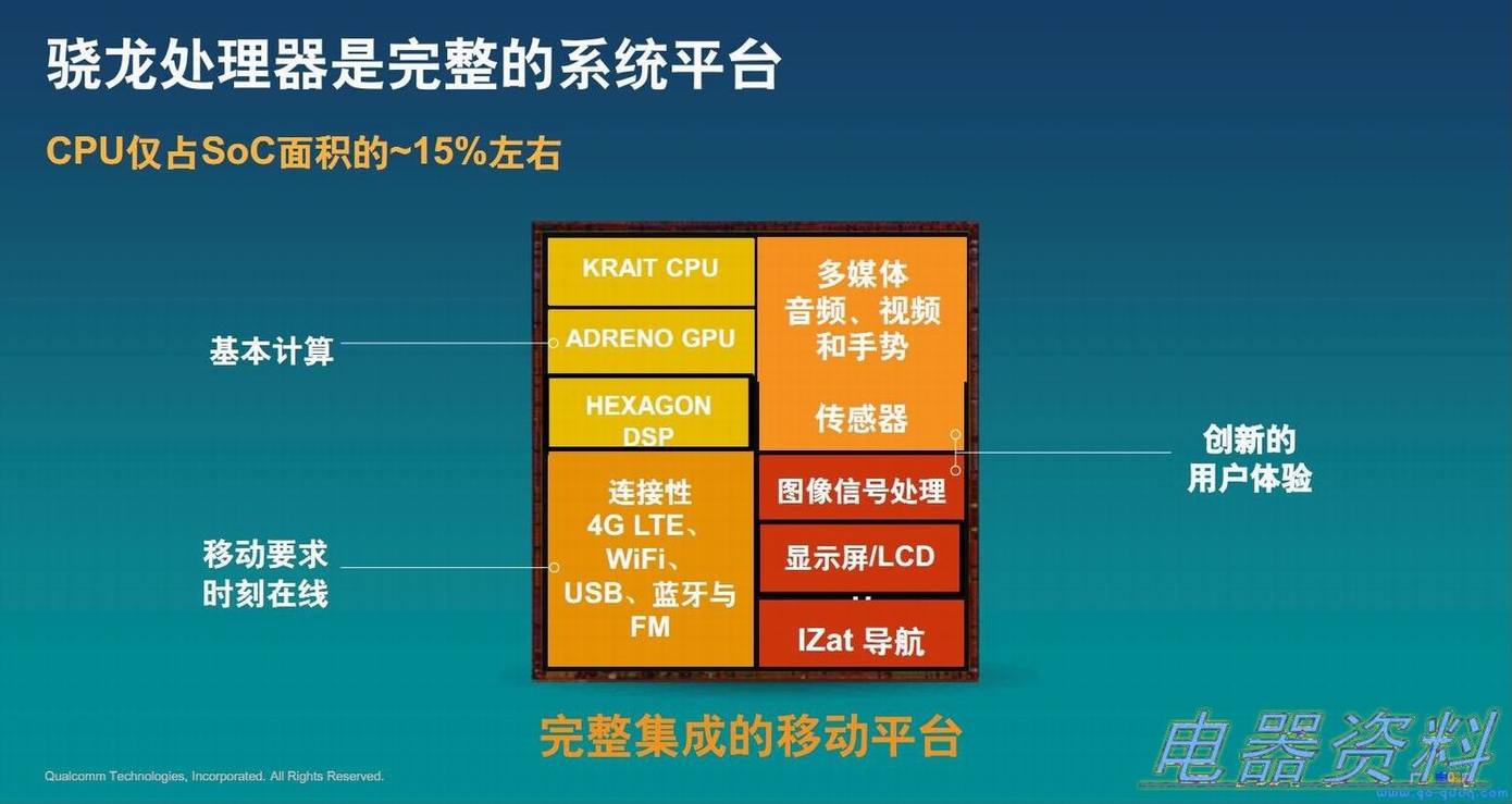 像高通骁龙这样的SoC,已经不能用我们以往看待PC处理器的眼光去看待它了。SoC是一个完整的系统,除了我们比较熟悉的CPU和GPU外,还拥有很多传统PC拥有和没有的功能单元,包含独立的音视频处理、图像处理ISP、MODEM芯片……而正是因为它高度整合了多种功能单元,再加上很低的功耗与发热,使得它会被越来越多地应用在各种智能设备上——绝不只是手机和平板电脑,在未来,即便是所有耗电的设备里面都有ARM处理器,也不是什么不可能的事。