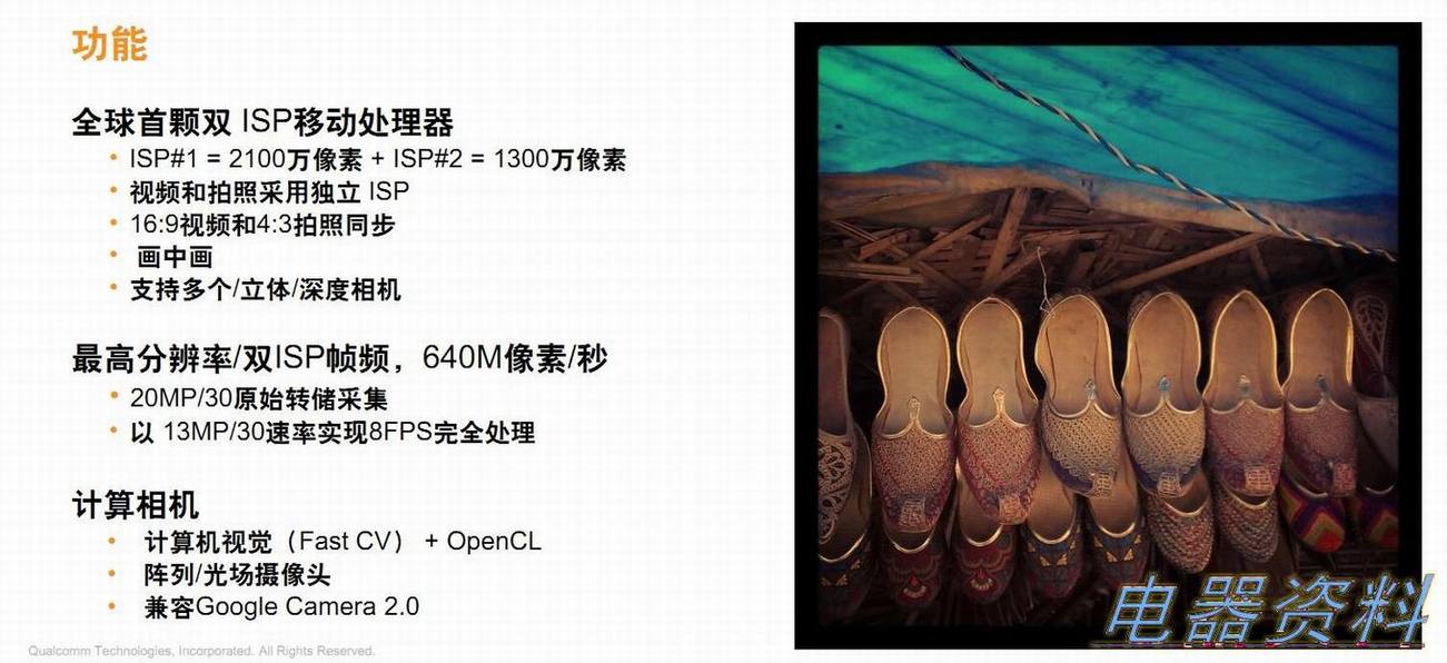 另外,说到视频拍摄,骁龙800还有个绝活,那就是内置双图像信号处理器(一颗最高支持2100、另一颗最高支持1300万像素)。两个摄像头可以同时独立工作,例如在一颗IPS负责处理视频(16比9)的时候,另一颗负责拍照片(4比3)。此外,利用双摄像头实现画中画、立体拍摄也是很容易的事。其实,除了这些硬规格,骁龙800所支持的FastCV(计算机视觉增强,由高通开发,支持所有ARM处理器,但专门为高通处理器作了优化,运行效率更高)也是个很酷的功能,它能做什么呢?打个比方,你有一部搭载骁龙800的车载图形系统,它可以帮你实时显示周围的车辆信息、距离、速度……而这些信息也可以通过3D图形的方式显示出来。车载系统只是FastCV应用的一部分,说不定将来的某某智能眼镜也会用上这项功能。