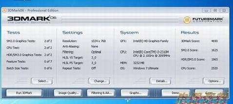 图片:上、下图分别为i3平台单通道和双通道内存时核芯显卡的3DMark06得分