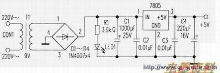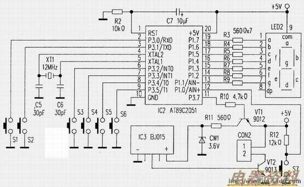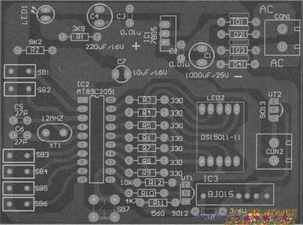 首先分析一下本块印制板。它是单片板,电源部分位于板右上方,从集成电路7805可以看出,D1~D4四个二板管构成桥式整流电路,7805三端稳压输出供给后级电路工作。核心电路是主控芯片AT89C205l单片机,S1~S6构成键盘输入电路,2为一构成显示电路,3构成报警电路。